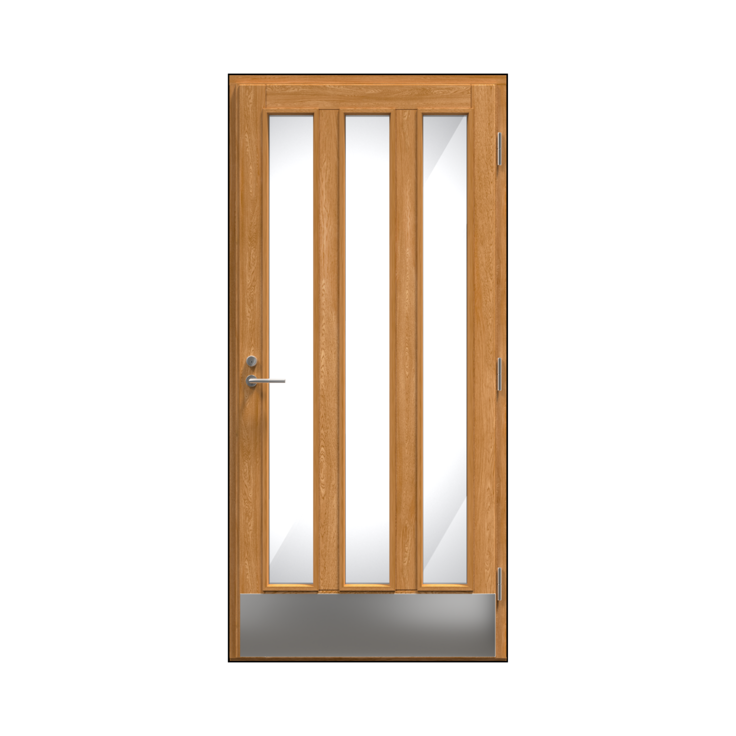 Havu modelim abās durvju pusēs standarta aprīkojumā ir 200 mm augsta matēta alumīnija plāksne apakšējā daļā. Šī atsitējplāksne pasargā durvis no skrāpējumiem, triecieniem un nodiluma, kas bieži rodas intensīvas lietošanas zonā – pie sliekšņa.