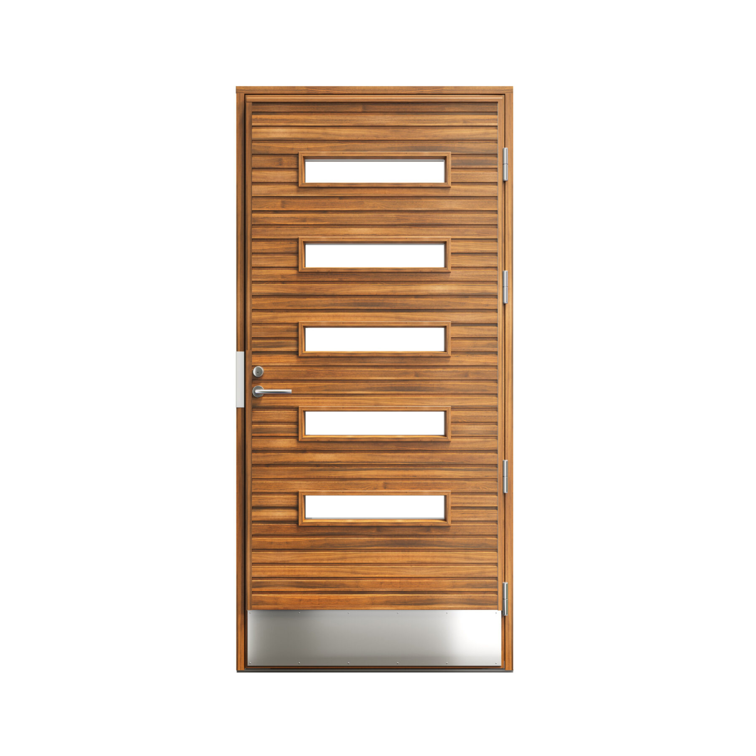 200 mm augstā matētā alumīnija plāksne durvju ārpusē aizsargā apakšējo vērtnes daļu no skrāpējumiem, sitieniem un netīrumiem – īpaši svarīgi ieejām, kur bieži izmanto apavus ar rupju zoli, velosipēdus, bērnu ratiņus vai citus priekšmetus, kas varētu bojāt koka virsmu.
