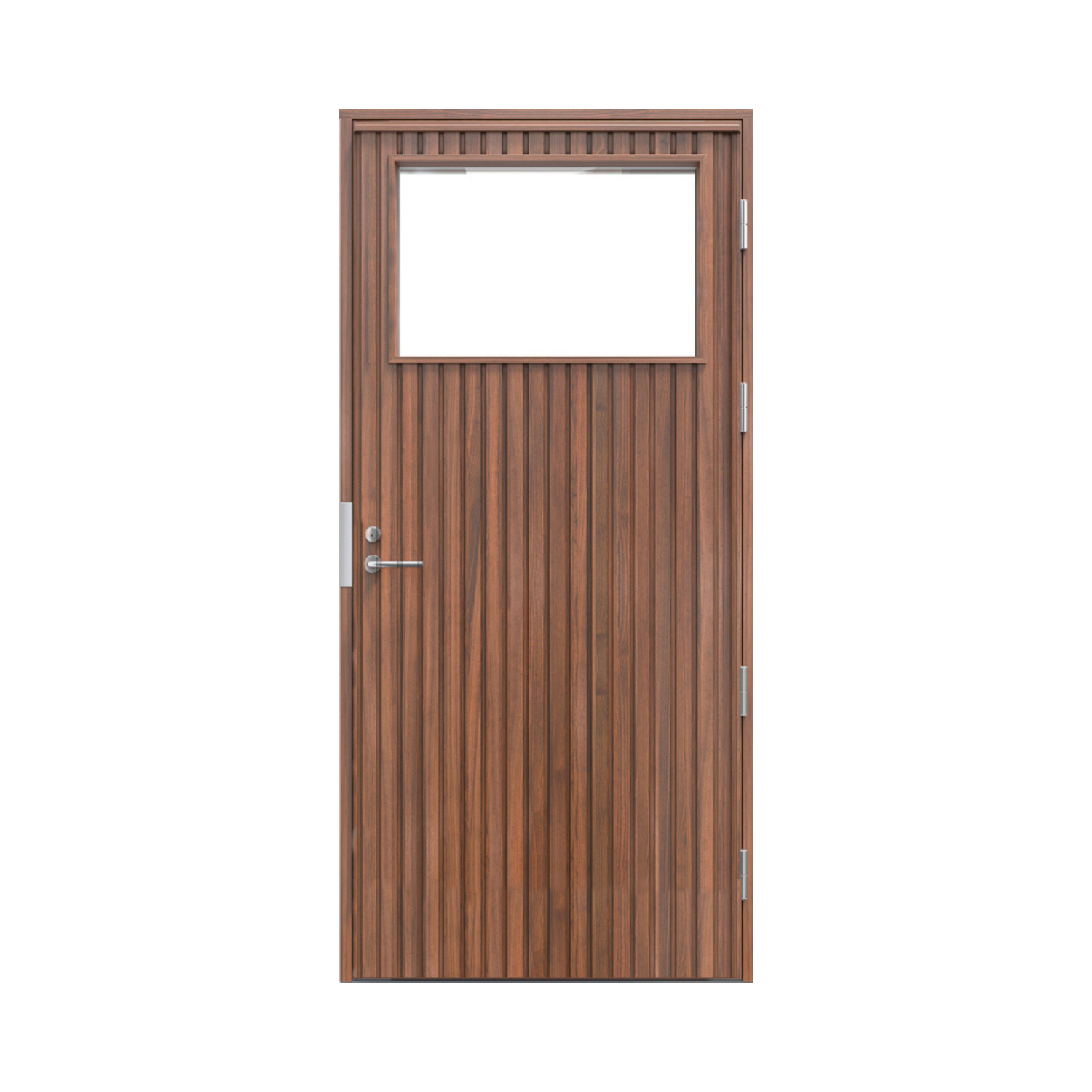 Vērtnes virspusē ir bezzaru priedes panelis ar kopējo biezumu 98 mm un paneļa joslas izmēru 58 mm. Vienmērīgais vertikālo paneļu ritms izceļ dabīgā koka tekstūru, piešķir durvīm Woodpanel kolekcijai raksturīgo vizuālo dziļumu un ļauj tām organiski iekļauties gan modernā, gan klasiskā fasādē.