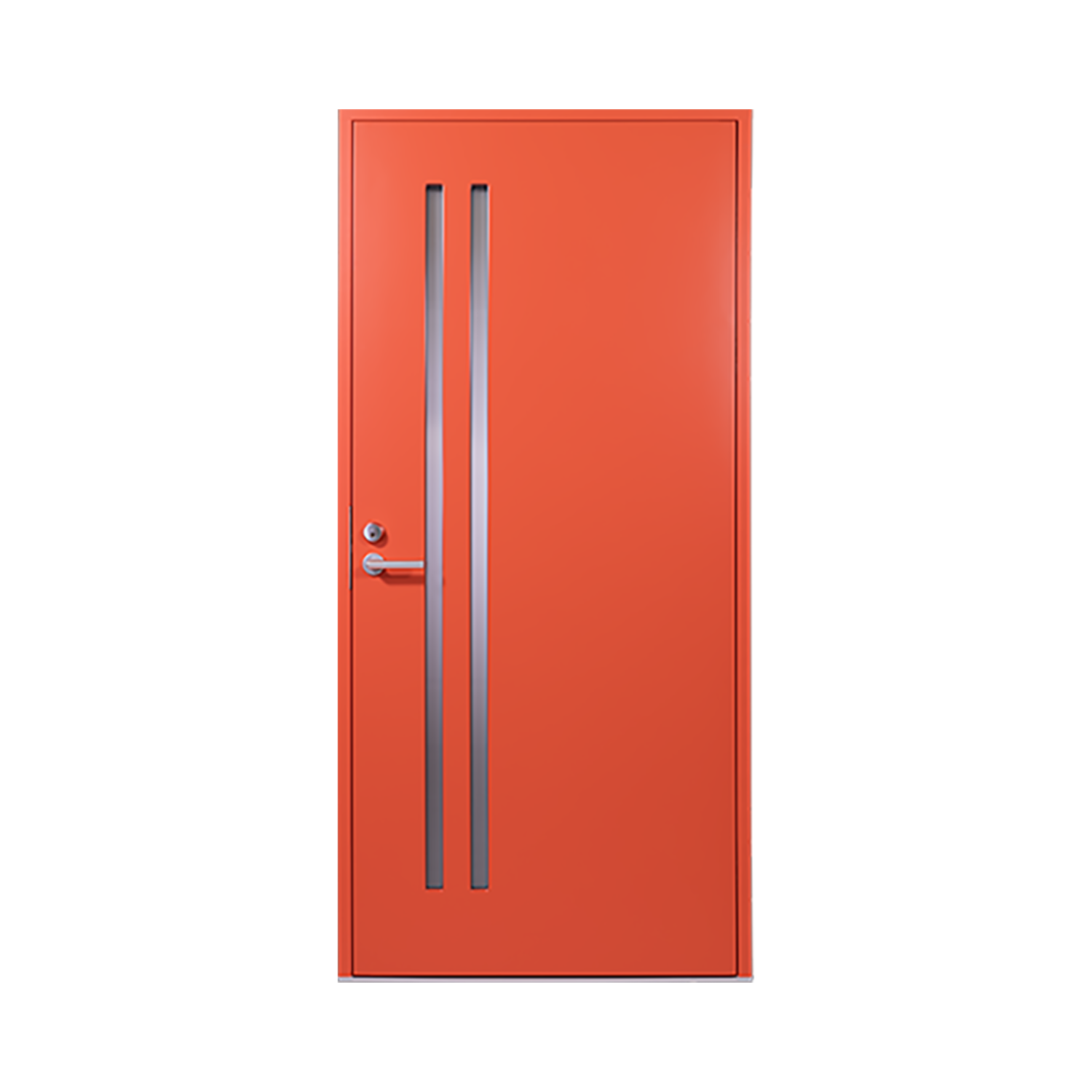 Dizaina ārdurvis ar gludu HDF virsmu un divām vertikālām stikla joslām, kas piešķir ieejai mūsdienīgu, dinamisku raksturu. HDF plātne pastiprināta ar alumīnija loksni, rāmis – no koka. Stiklojums bez stikla līstēm, ar paslēptām eņģēm, Thermo vērtnes biezums – 86 mm. Standarta komplektācijā – caurspīdīgs trīskāršais stikls ar lielisku siltumizolāciju.