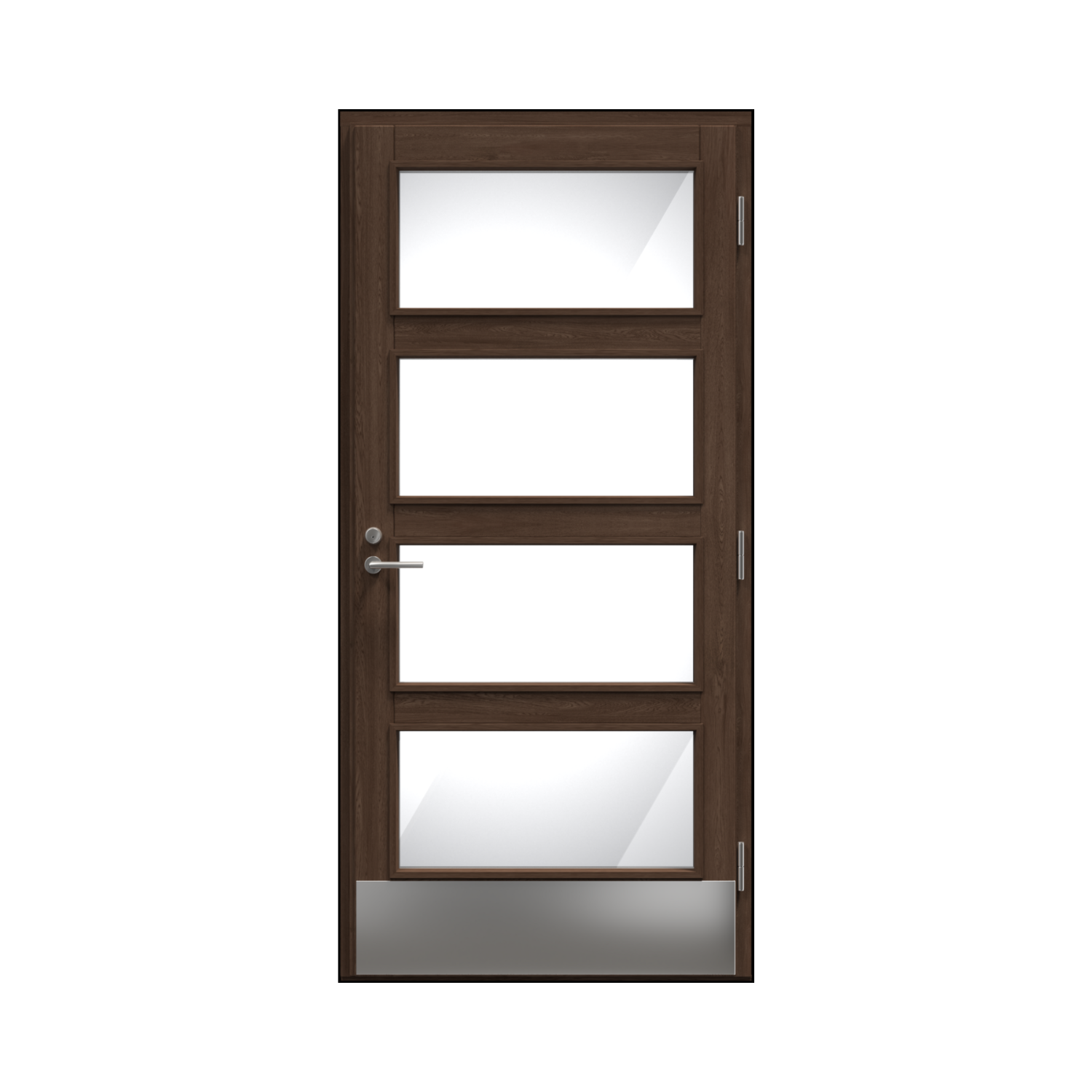 Tyrni modelim abās durvju pusēs standarta komplektācijā ir 200 mm augsta matēta alumīnija plāksne apakšējā daļā. Šī aizsargjosla efektīvi pasargā durvju pārsegu no skrāpējumiem, triecieniem un nodiluma, kas bieži rodas intensīvas lietošanas zonā – pie sliekšņa.